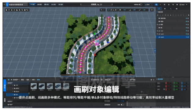 Используя редактор сцен с рендерингом на стороне клиента Tiguan Engine , можно быстро создавать трехмерные сцены перекрестка простым перетаскиванием элементов. Платформа предлагает богатую библиотеку моделей, включающую транспортные сооружения, автомобили, пешеходов и различные элементы окружающей среды. По мере необходимости можно выбирать подходящие модели и легко корректировать их положение, размер и свойства. С помощью встроенных инструментов рисования можно эффективно отрисовывать большое количество объектов, быстро создавая детализированную среду цифрового двойника перекрестка.