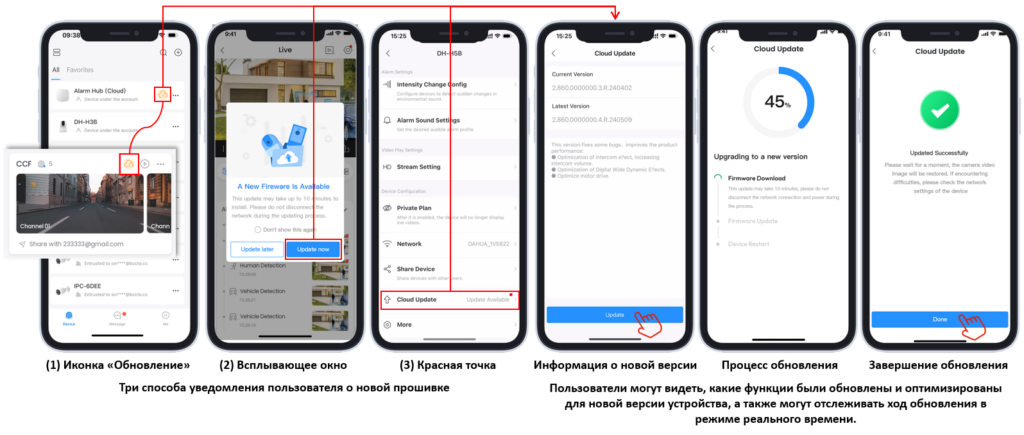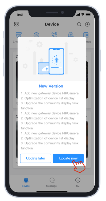 - Если доступна новая версия приложения, DMSS может отправить пользователю уведомление об обновлении приложения, представляя содержимое новой версии.