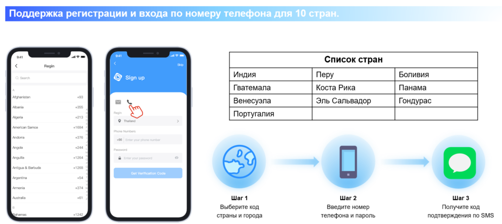 Поддержка регистрации и входа по номеру телефона для 10 стран.