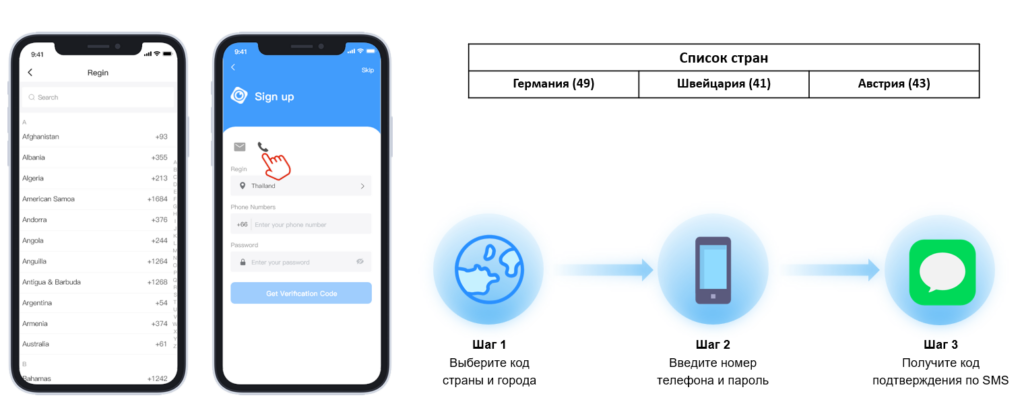 3.1 Регистрация и вход по номеру телефона для 3 стран.